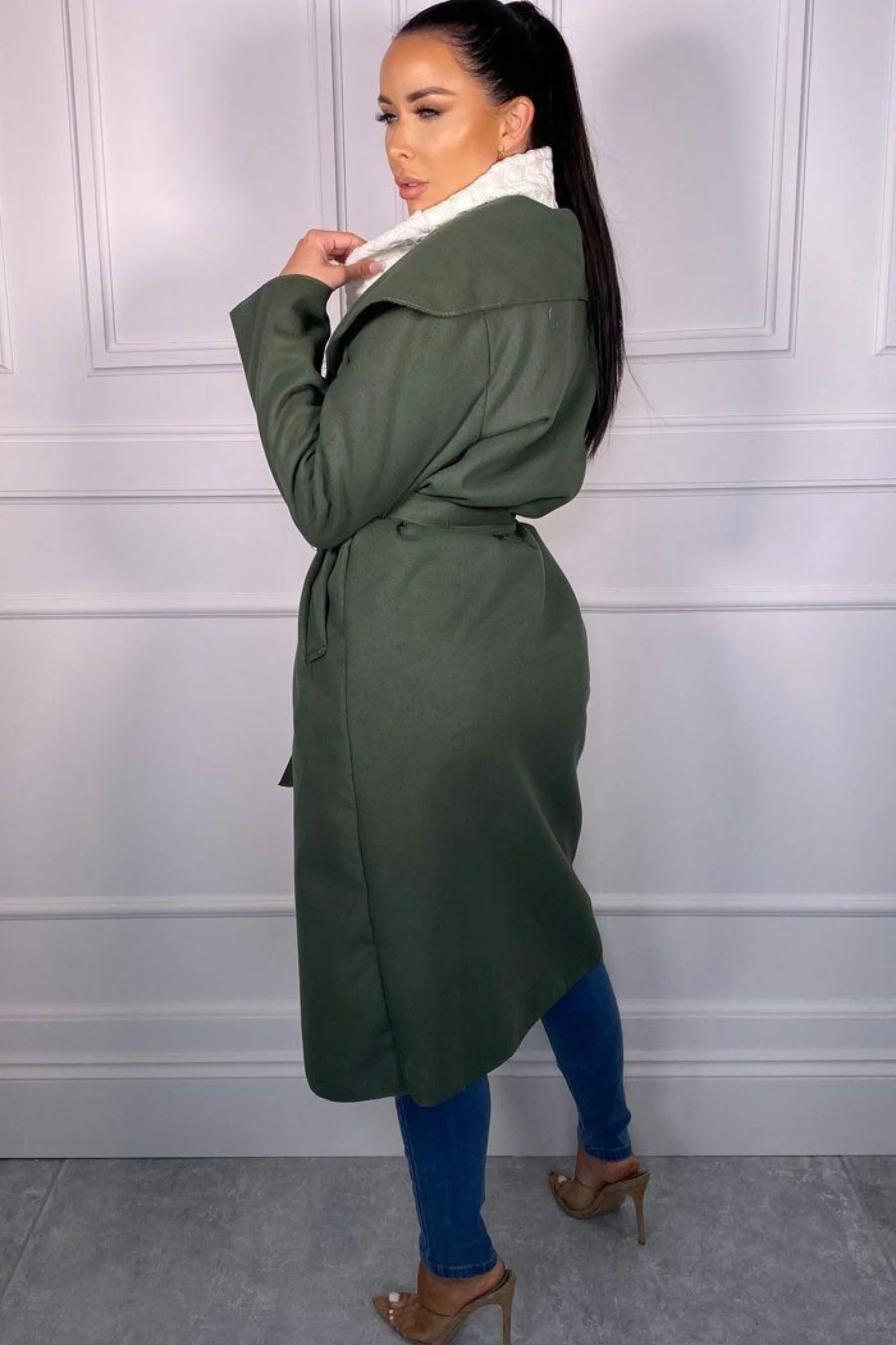 Khaki Waterfall Duster Belted Long Coat - Pola
