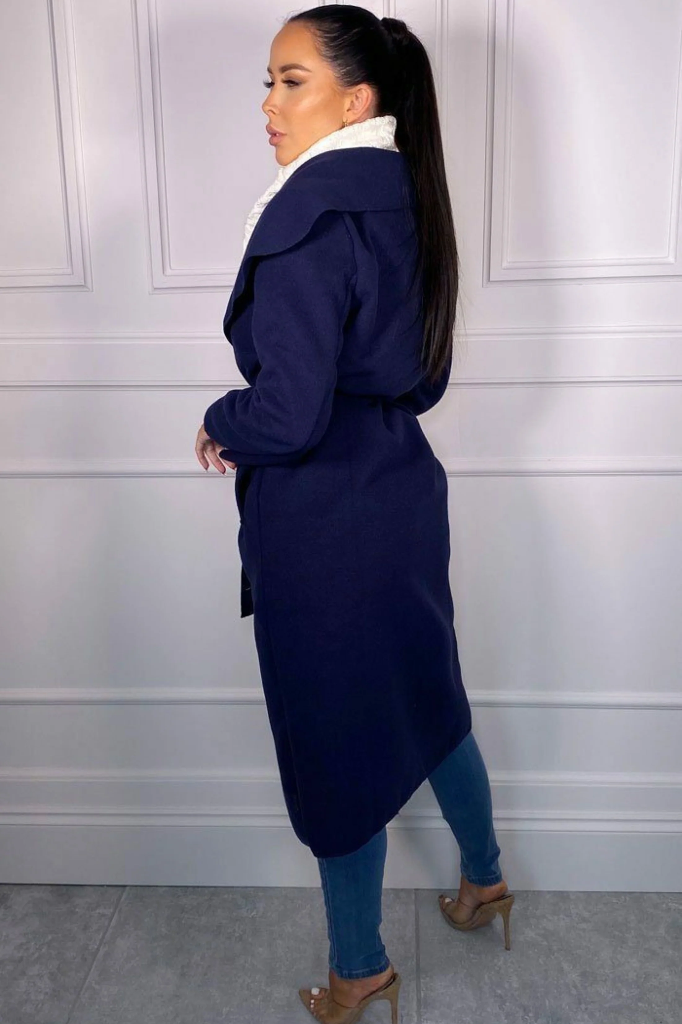 NAVY ITALIAN COLLAR BELTED LONG COAT
