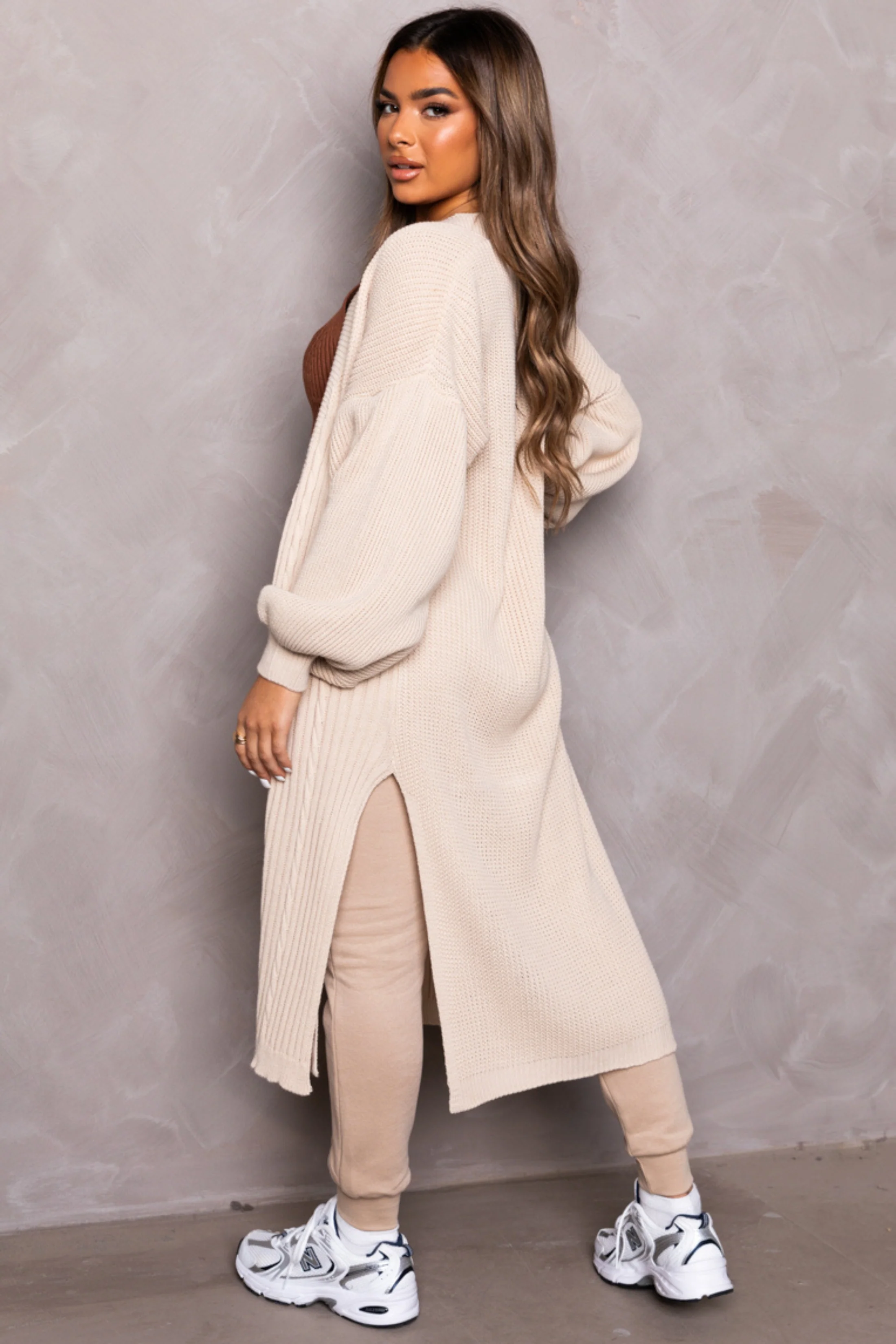 Stone Knitted Balloon Sleeve Side Split Longline Midi Cardigan