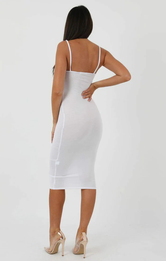 Our white strappy bodycon midi dress is making us weak at our knees. Its classic design and figure-hugging quality makes this a piece for any wardrobe ready to be partnered with some vintage metallic heels and a statement clutch.